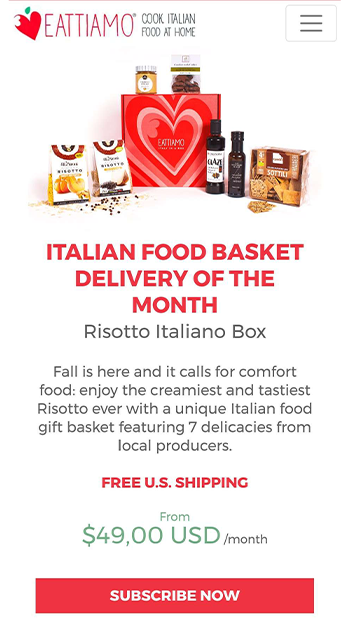 Eattiamo è la prima startup che porta ogni mese direttamente sulla tavola di centinaia di famiglie americane una box con una selezione dei migliori prodotti italiani e tutte le informazioni per cucinarli in maniera facile e veloce. Ogni mese una scoperta culinaria diversa per il cliente e un’opportunità di crescita sul mercato statunitense per i produttori.